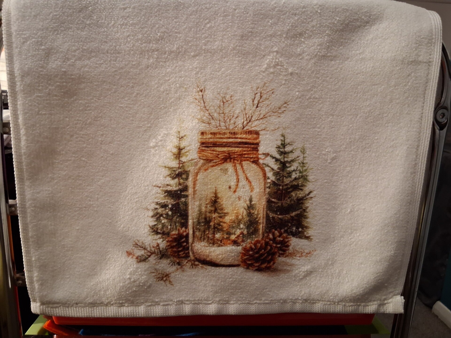 White tea towel with different designs.